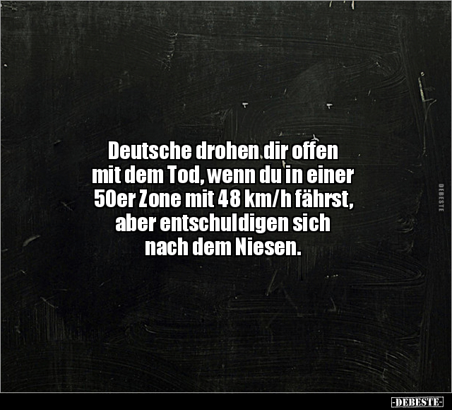 Deutsche drohen dir offen mit dem Tod, wenn du in einer 50er Zone mit 48 km/h fährst, aber entschuldigen sich nach dem Niesen.