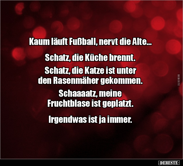 Kaum läuft Fußball, nervt die Alte... Schatz, die Küche brennt. Schatz, die Katze ist unter den Rasenmäher gekommen. Schaaaatz, meine Fruchtblase ist geplatzt. Irgendwas ist ja immer.