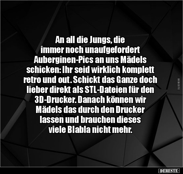 An all die Jungs, die immer noch unaufgefordert Auberginen-Pics an uns Mädels schicken: Ihr seid wirklich komplett retro und out. Schickt das Ganze doch lieber direkt als STL-Dateien für den 3D-Drucker. Danach können wir Mädels das durch den Drucker lassen und brauchen dieses viele Blabla nicht mehr.