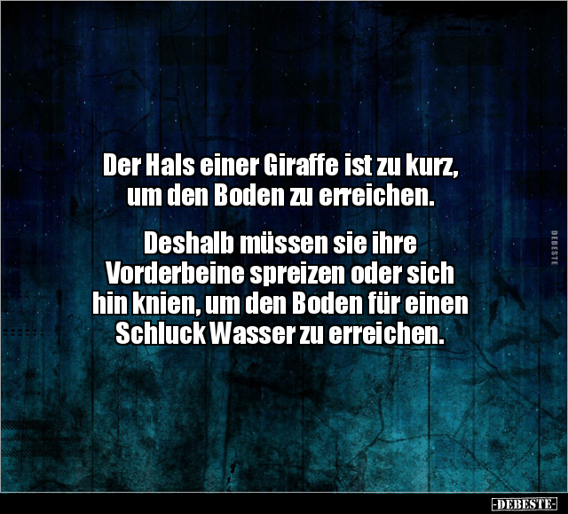 Der Hals einer Giraffe ist zu kurz, um den Boden zu erreichen. Deshalb müssen sie ihre Vorderbeine spreizen oder sich hin knien, um den Boden für einen Schluck Wasser zu erreichen.