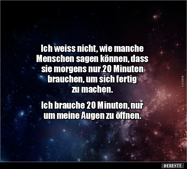 Ich weiss nicht, wie manche Menschen sagen können, dass sie morgens nur 20 Minuten brauchen, um sich fertig zu machen. Ich brauche 20 Minuten, nur um meine Augen zu öffnen.