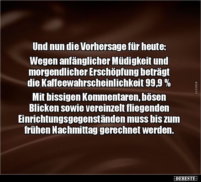 Und nun die Vorhersage für heute: Wegen anfänglicher Müdigkeit und morgendlicher Erschöpfung beträgt die Kaffeewahrscheinlichkeit 99,9 % Mit bissigen Kommentaren, bösen Blicken sowie vereinzelt fliegenden Einrichtungsgegenständen muss bis zum frühen Nachmittag gerechnet werden.