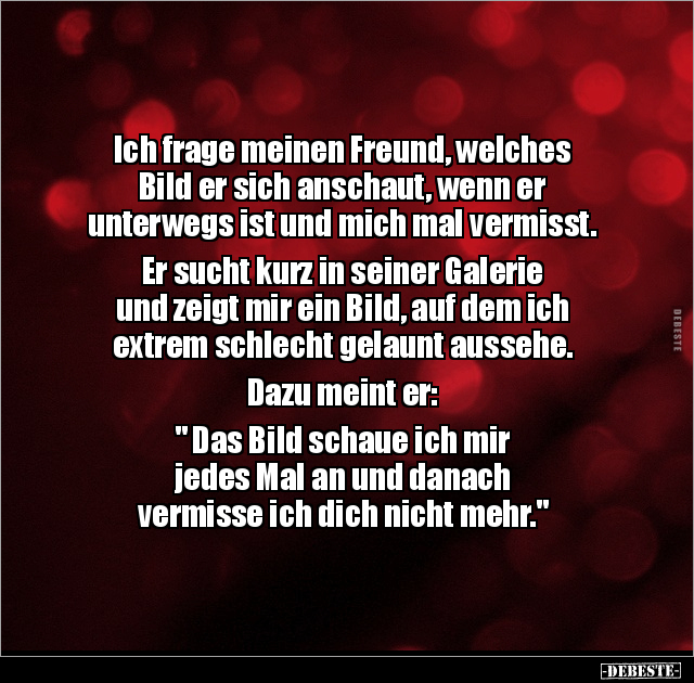Ich frage meinen Freund, welches Bild er sich anschaut, wenn er unterwegs ist und mich mal vermisst. Er sucht kurz in seiner Galerie und zeigt mir ein Bild, auf dem ich extrem schlecht gelaunt aussehe. Dazu meint er: " Das Bild schaue ich mir jedes Mal an und danach vermisse ich dich nicht mehr."