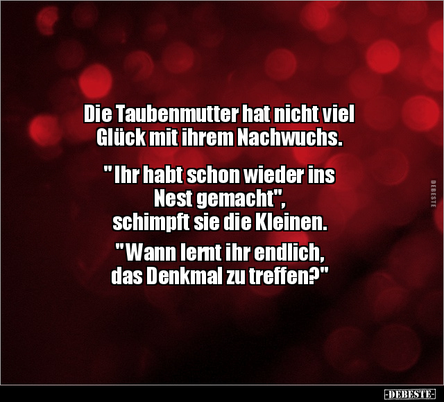 Die Taubenmutter hat nicht viel Glück mit ihrem Nachwuchs. " Ihr habt schon wieder ins Nest gemacht", schimpft sie die Kleinen. " Wann lernt ihr endlich, das Denkmal zu treffen?"