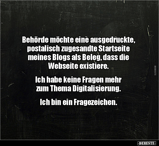 Behörde möchte eine ausgedruckte, postalisch zugesandte Startseite meines Blogs als Beleg, dass die Webseite existiere. Ich habe keine Fragen mehr zum Thema Digitalisierung. Ich bin ein Fragezeichen.