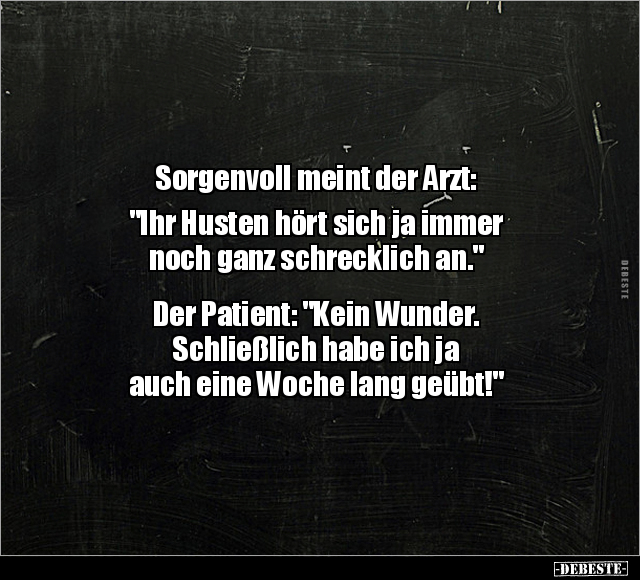 Sorgenvoll meint der Arzt: "Ihr Husten hört sich ja immer noch ganz schrecklich an." Der Patient: "Kein Wunder. Schließlich habe ich ja auch eine Woche lang geübt!"