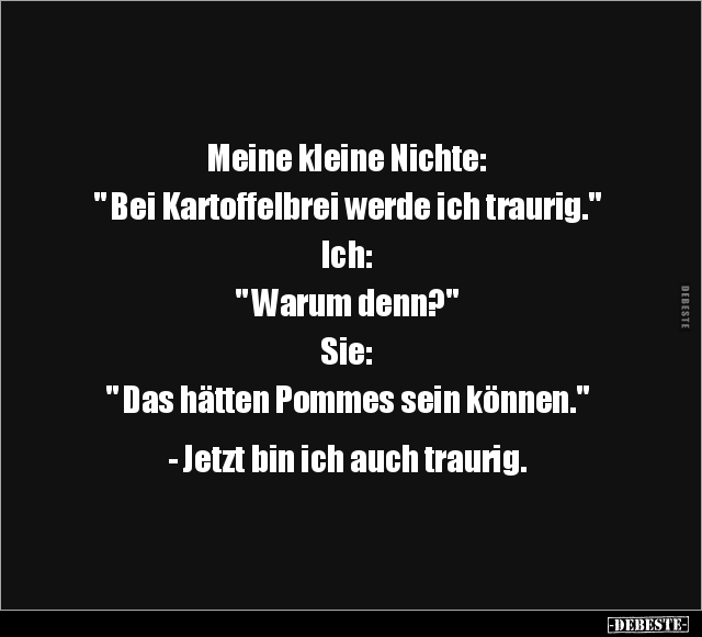 Meine kleine Nichte: " Bei Kartoffelbrei werde ich traurig." Ich: " Warum denn?" Sie: " Das hätten Pommes sein können." - Jetzt bin ich auch traurig.