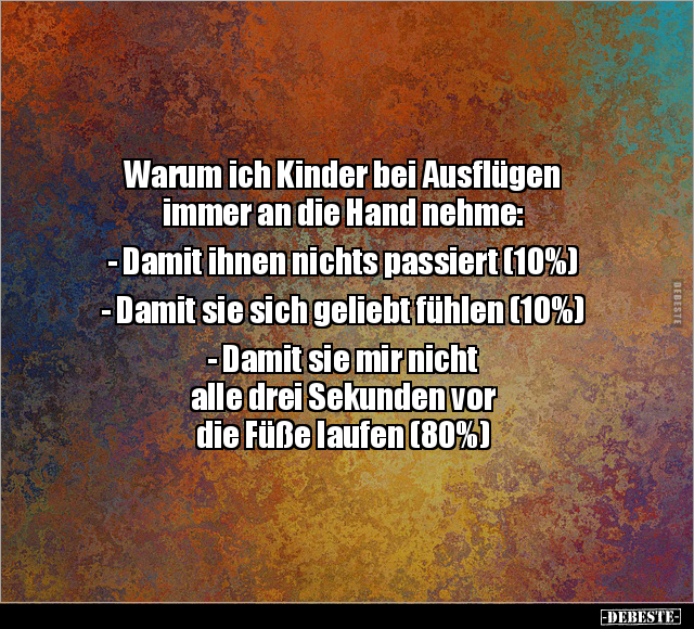 Warum ich Kinder bei Ausflügen immer an die Hand nehme: - Damit ihnen nichts passiert (10%) - Damit sie sich geliebt fühlen (10%) - Damit sie mir nicht alle drei Sekunden vor die Füße laufen (80%)