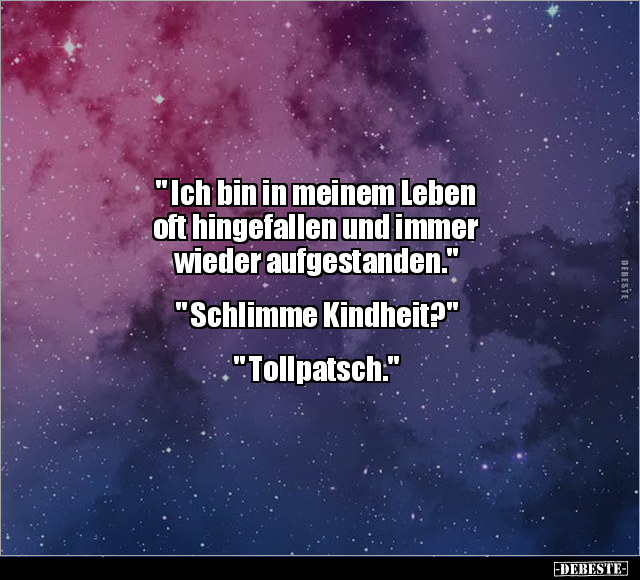 " Ich bin in meinem Leben oft hingefallen und immer wieder aufgestanden." " Schlimme Kindheit?" " Tollpatsch."