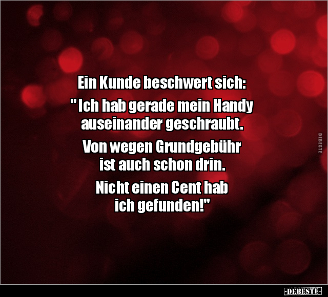 Ein Kunde beschwert sich: " Ich hab gerade mein Handy auseinander geschraubt. Von wegen Grundgebühr ist auch schon drin. Nicht einen Cent hab ich gefunden!"