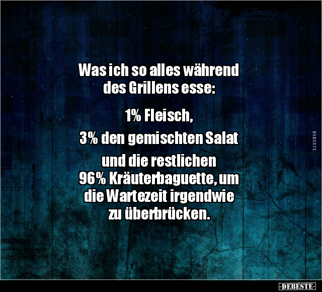 Was ich so alles während des Grillens esse: 1% Fleisch, 3% den gemischten Salat und die restlichen 96% Kräuterbaguette, um die Wartezeit irgendwie zu überbrücken.