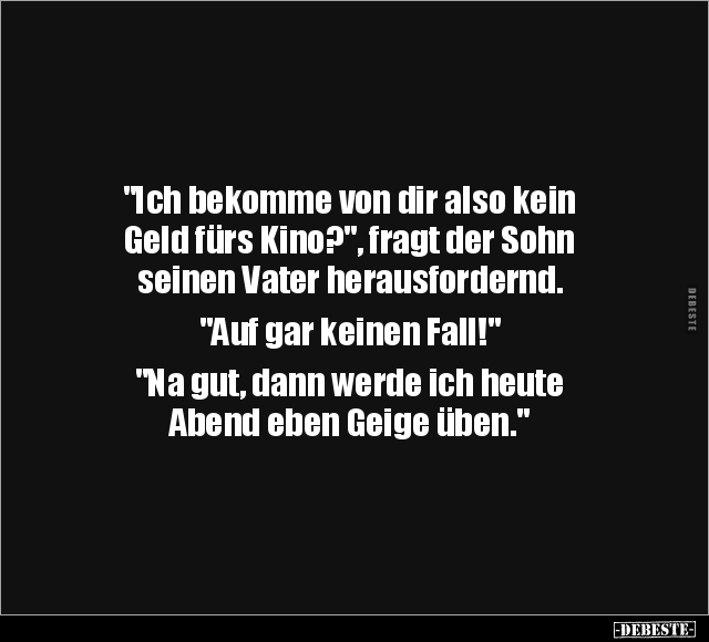 "Ich bekomme von dir also kein Geld fürs Kino?", fragt der Sohn seinen Vater herausfordernd. "Auf gar keinen Fall!" "Na gut, dann werde ich heute Abend eben Geige üben."