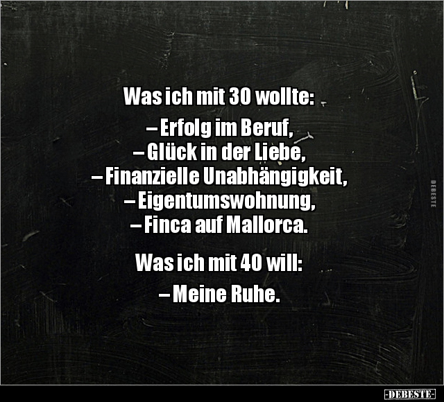 Was ich mit 30 wollte: – Erfolg im Beruf, – Glück in der Liebe, – Finanzielle Unabhängigkeit, – Eigentumswohnung, – Finca auf Mallorca. Was ich mit 40 will: – Meine Ruhe.