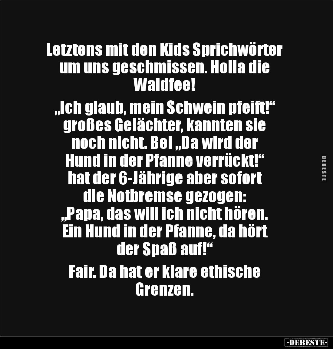 Letztens mit den Kids Sprichwörter um uns geschmissen. Holla die Waldfee! „Ich glaub, mein Schwein pfeift!“ großes Gelächter, kannten sie noch nicht. Bei „Da wird der Hund in der Pfanne verrückt!“ hat der 6-Jährige aber sofort die Notbremse gezogen: „Papa, das will ich nicht hören. Ein Hund in der Pfanne, da hört der Spaß auf!“ Fair. Da hat er klare ethische Grenzen.