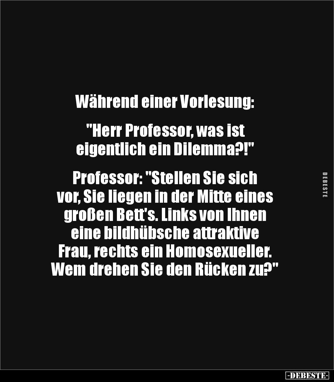Während einer Vorlesung: "Herr Professor, was ist eigentlich ein Dilemma?!" Professor: "Stellen Sie sich vor, Sie liegen in der Mitte eines großen Bett's. Links von Ihnen eine bildhübsche attraktive Frau, rechts ein Homosexueller. Wem drehen Sie den Rücken zu?"