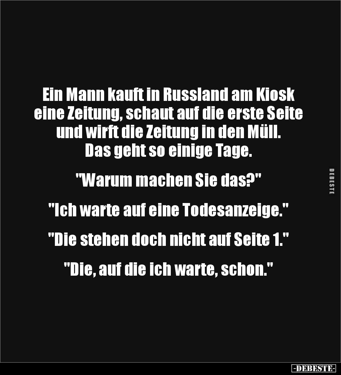 Ein Mann kauft in Russland am Kiosk eine Zeitung, schaut auf die erste Seite und wirft die Zeitung in den Müll. Das geht so einige Tage. "Warum machen Sie das?" "Ich warte auf eine Todesanzeige." "Die stehen doch nicht auf Seite 1." "Die, auf die ich warte, schon."