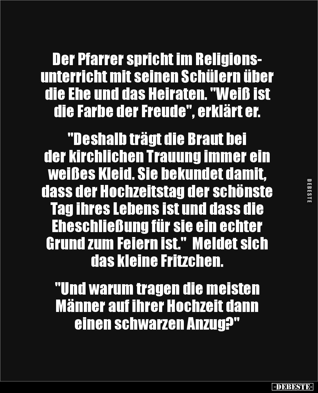 Der Pfarrer spricht im Religions- unterricht mit seinen Schülern über die Ehe und das Heiraten. "Weiß ist die Farbe der Freude", erklärt er. "Deshalb trägt die Braut bei der kirchlichen Trauung immer ein weißes Kleid. Sie bekundet damit, dass der Hochzeitstag der schönste Tag ihres Lebens ist und dass die Eheschließung für sie ein echter Grund zum Feiern ist." Meldet sich das kleine Fritzchen. "Und warum tragen die meisten Männer auf ihrer Hochzeit dann einen schwarzen Anzug?"