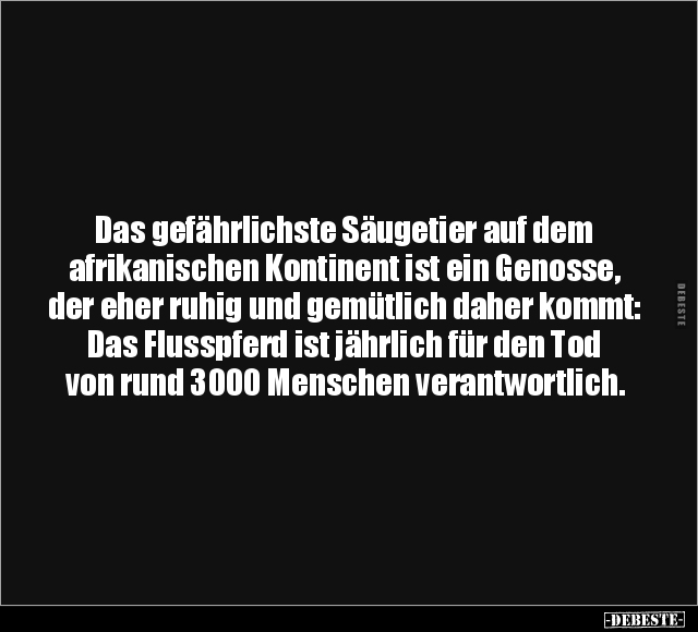 Das gefährlichste Säugetier auf dem afrikanischen Kontinent ist ein Genosse, der eher ruhig und gemütlich daher kommt: Das Flusspferd ist jährlich für den Tod von rund 3000 Menschen verantwortlich.
