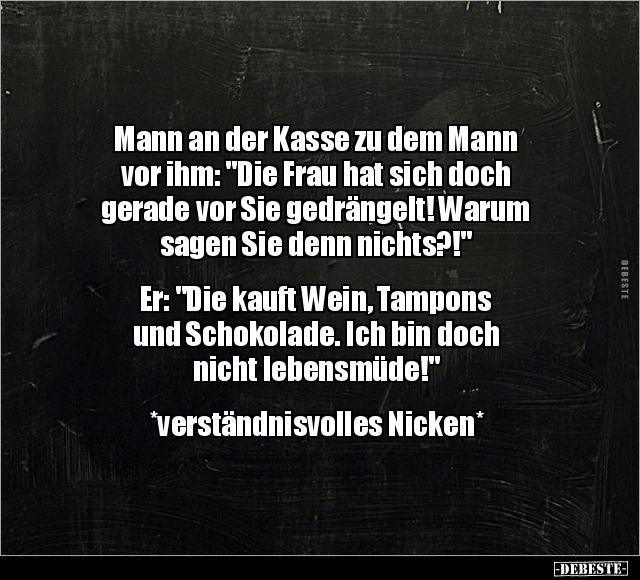 Mann an der Kasse zu dem Mann vor ihm: "Die Frau hat sich doch gerade vor Sie gedrängelt! Warum sagen Sie denn nichts?!" Er: "Die kauft Wein, Tampons und Schokolade. Ich bin doch nicht lebensmüde!" *verständnisvolles Nicken*