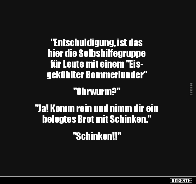 "Entschuldigung, ist das hier die Selbshilfegruppe für Leute mit einem "Eis- gekühlter Bommerlunder" "Ohrwurm?" "Ja! Komm rein und nimm dir ein belegtes Brot mit Schinken." "Schinken!!"