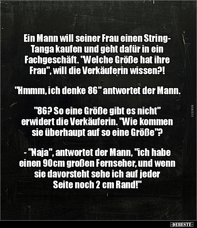 Ein Mann will seiner Frau einen String- Tanga kaufen und geht dafür in ein Fachgeschäft. "Welche Größe hat ihre Frau", will die Verkäuferin wissen?! "Hmmm, ich denke 86" antwortet der Mann. "86? So eine Größe gibt es nicht" erwidert die Verkäuferin. "Wie kommen sie überhaupt auf so eine Größe"? - "Naja", antwortet der Mann, "ich habe einen 90cm großen Fernseher, und wenn sie davorsteht sehe ich auf jeder Seite noch 2 cm Rand!"