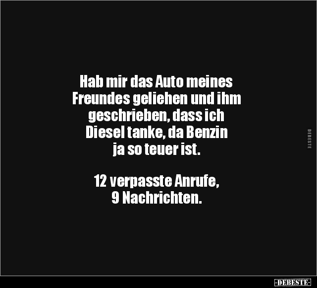 Hab mir das Auto meines Freundes geliehen und ihm geschrieben, dass ich Diesel tanke, da Benzin ja so teuer ist. 12 verpasste Anrufe, 9 Nachrichten.