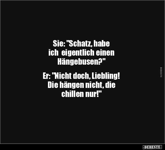 Sie: "Schatz, habe ich eigentlich einen Hängebusen?" Er: "Nicht doch, Liebling! Die hängen nicht, die chillen nur!"