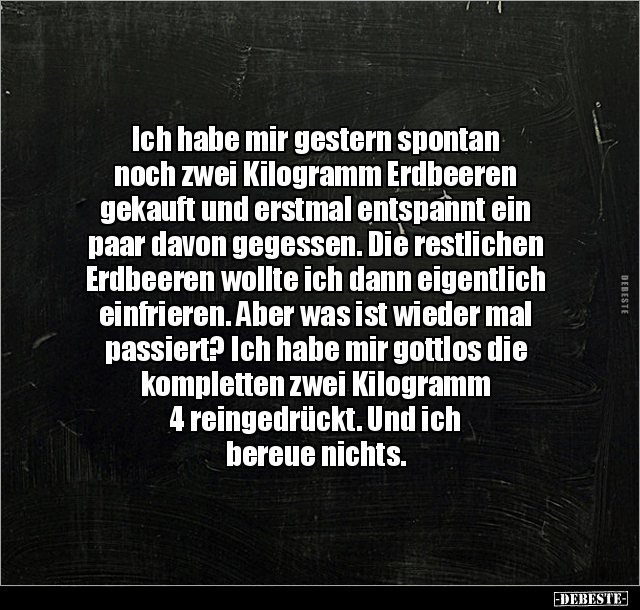 Ich habe mir gestern spontan noch zwei Kilogramm Erdbeeren gekauft und erstmal entspannt ein paar davon gegessen. Die restlichen Erdbeeren wollte ich dann eigentlich einfrieren. Aber was ist wieder mal passiert? Ich habe mir gottlos die kompletten zwei Kilogramm 4 reingedrückt. Und ich bereue nichts.