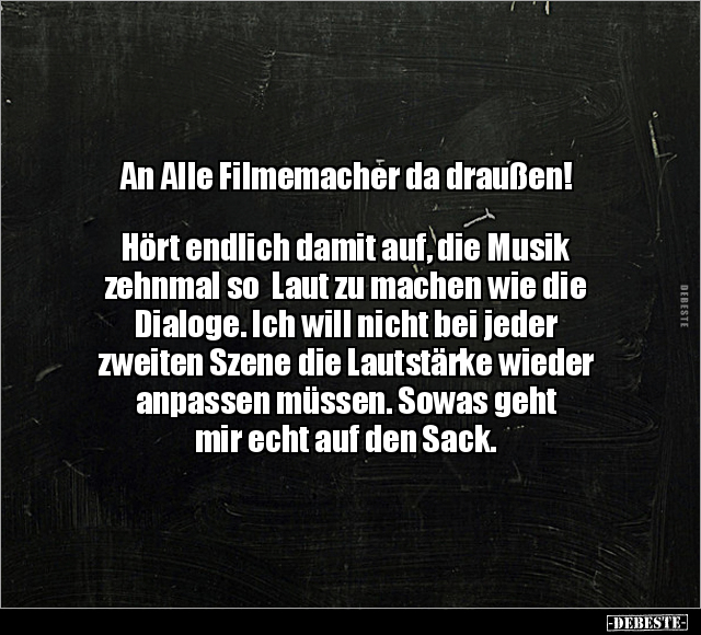 An Alle Filmemacher da draußen! Hört endlich damit auf, die Musik zehnmal so Laut zu machen wie die Dialoge. Ich will nicht bei jeder zweiten Szene die Lautstärke wieder anpassen müssen. Sowas geht mir echt auf den Sack.