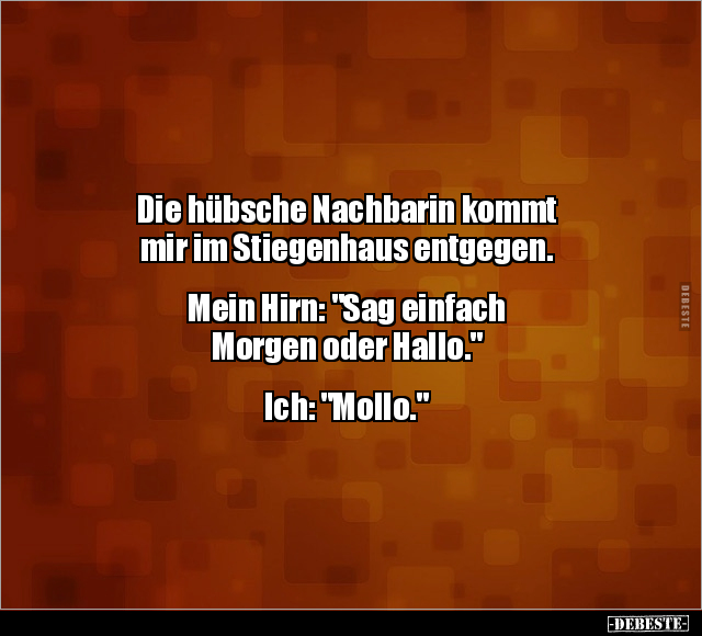 Die hübsche Nachbarin kommt mir im Stiegenhaus entgegen. Mein Hirn: "Sag einfach Morgen oder Hallo." Ich: "Mollo."