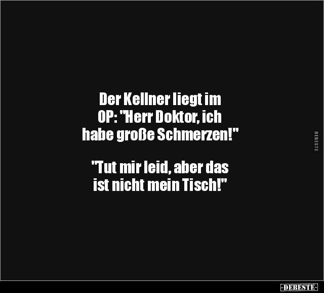 Der Kellner liegt im OP: "Herr Doktor, ich habe große Schmerzen!" "Tut mir leid, aber das ist nicht mein Tisch!"