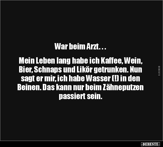 War beim Arzt. . . Mein Leben lang habe ich Kaffee, Wein, Bier, Schnaps und Likör getrunken. Nun sagt er mir, ich habe Wasser (!) in den Beinen. Das kann nur beim Zähneputzen passiert sein.