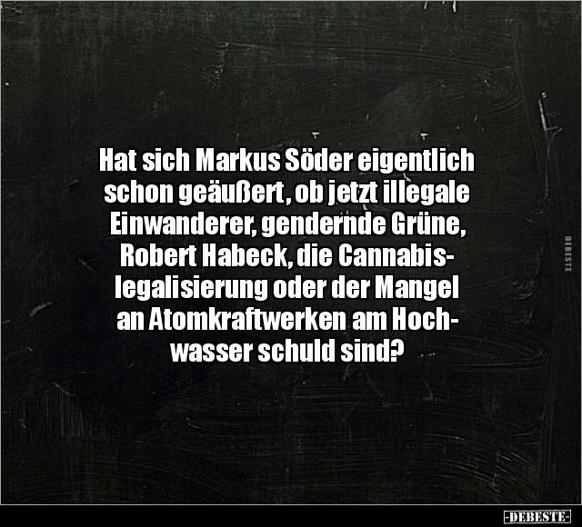 Hat sich Markus Söder eigentlich schon geäußert, ob jetzt illegale Einwanderer, gendernde Grüne, Robert Habeck, die Cannabis- legalisierung oder der Mangel an Atomkraftwerken am Hoch- wasser schuld sind?