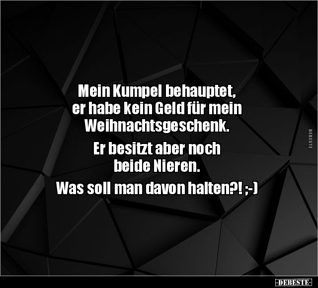 Mein Kumpel behauptet, er habe kein Geld für mein Weihnachtsgeschenk. Er besitzt aber noch beide Nieren. Was soll man davon halten?! ;-)