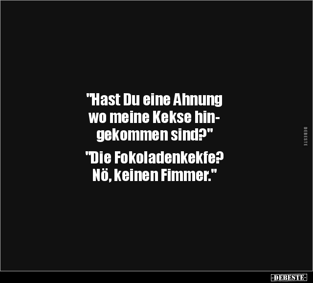 "Hast Du eine Ahnung wo meine Kekse hin- gekommen sind?" "Die Fokoladenkekfe? Nö, keinen Fimmer."