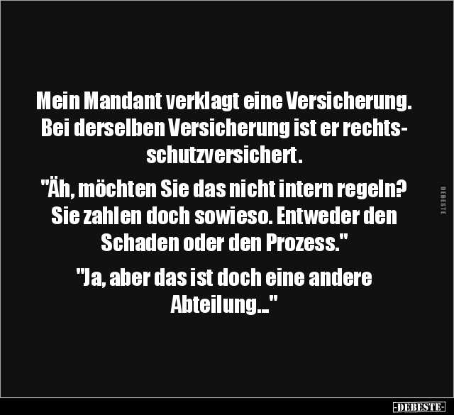 Mein Mandant verklagt eine Versicherung. Bei derselben Versicherung ist er rechts- schutzversichert. "Äh, möchten Sie das nicht intern regeln? Sie zahlen doch sowieso. Entweder den Schaden oder den Prozess." "Ja, aber das ist doch eine andere Abteilung..."