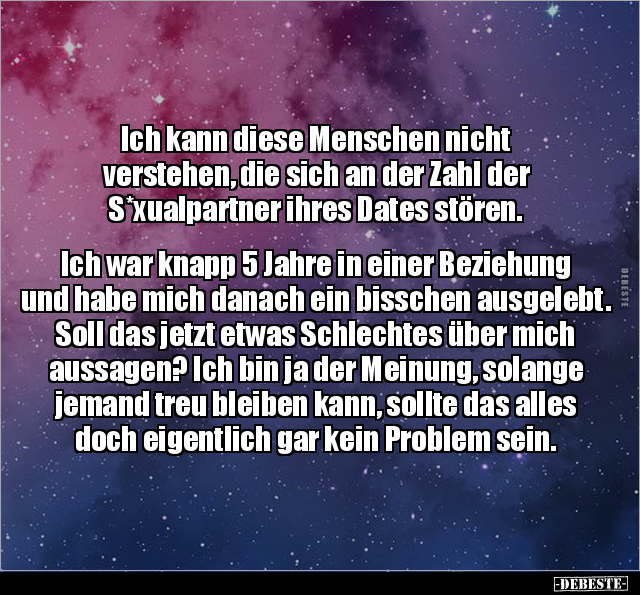 Ich kann diese Menschen nicht verstehen, die sich an der Zahl der S*xualpartner ihres Dates stören. Ich war knapp 5 Jahre in einer Beziehung und habe mich danach ein bisschen ausgelebt. Soll das jetzt etwas Schlechtes über mich aussagen? Ich bin ja der Meinung, solange jemand treu bleiben kann, sollte das alles doch eigentlich gar kein Problem sein.
