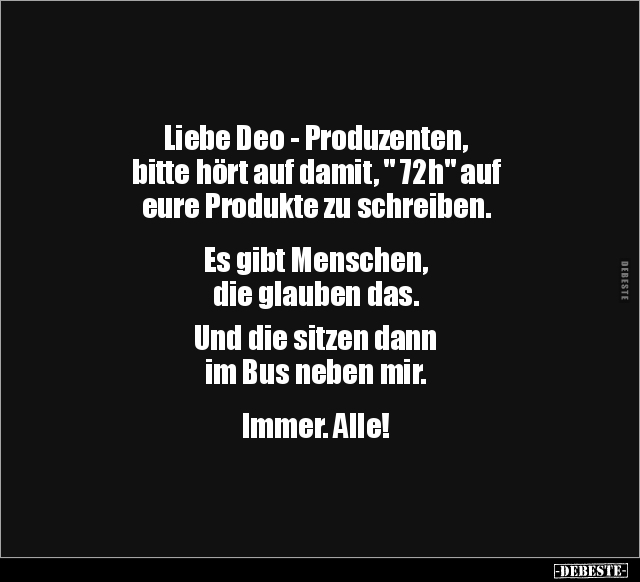 Liebe Deo - Produzenten, bitte hört auf damit, " 72h" auf eure Produkte zu schreiben. Es gibt Menschen, die glauben das. Und die sitzen dann im Bus neben mir. Immer. Alle!