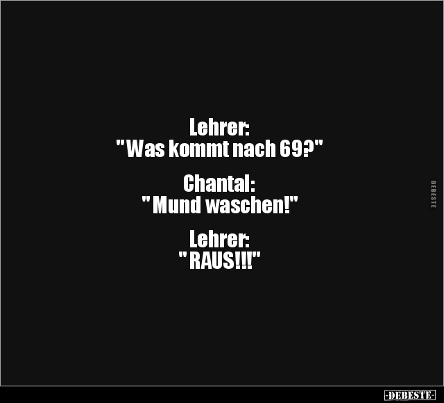 Lehrer: " Was kommt nach 69?" Chantal: " Mund waschen!" Lehrer: " RAUS!!!"