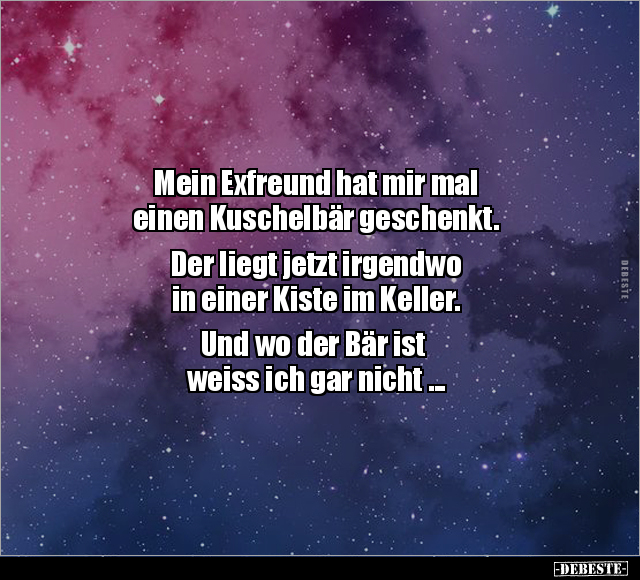 Mein Exfreund hat mir mal einen Kuschelbär geschenkt. Der liegt jetzt irgendwo in einer Kiste im Keller. Und wo der Bär ist weiss ich gar nicht ...