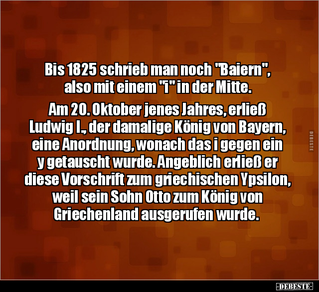 Bis 1825 schrieb man noch "Baiern", also mit einem "i" in der Mitte. Am 20. Oktober jenes Jahres, erließ Ludwig I., der damalige König von Bayern, eine Anordnung, wonach das i gegen ein y getauscht wurde. Angeblich erließ er diese Vorschrift zum griechischen Ypsilon, weil sein Sohn Otto zum König von Griechenland ausgerufen wurde.