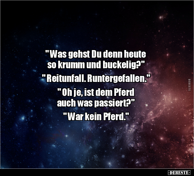 " Was gehst Du denn heute so krumm und buckelig?" " Reitunfall. Runtergefallen." " Oh je, ist dem Pferd auch was passiert?" " War kein Pferd."