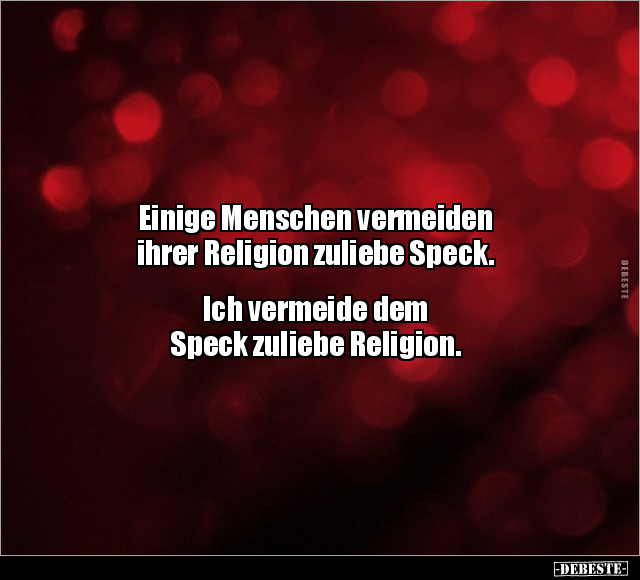 Einige Menschen vermeiden ihrer Religion zuliebe Speck. Ich vermeide dem Speck zuliebe Religion.