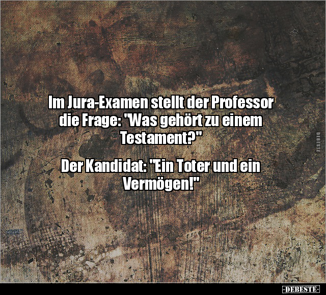 Im Jura-Examen stellt der Professor die Frage: "Was gehört zu einem Testament?" Der Kandidat: "Ein Toter und ein Vermögen!"