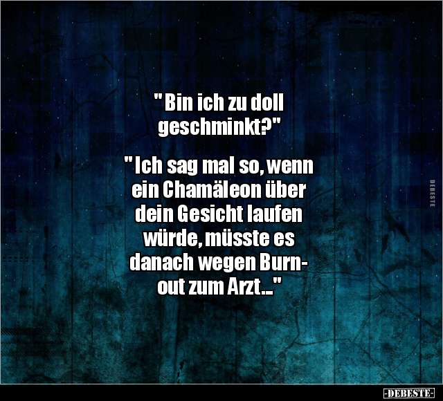 " Bin ich zu doll geschminkt?" " Ich sag mal so, wenn ein Chamäleon über dein Gesicht laufen würde, müsste es danach wegen Burn- out zum Arzt..."