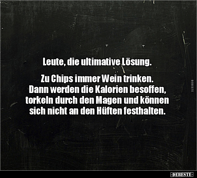 Leute, die ultimative Lösung. Zu Chips immer Wein trinken. Dann werden die Kalorien besoffen, torkeln durch den Magen und können sich nicht an den Hüften festhalten.