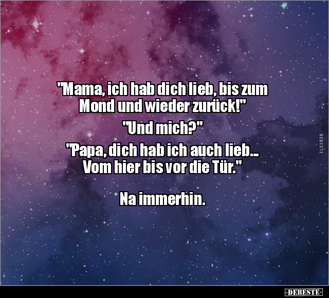"Mama, ich hab dich lieb, bis zum Mond und wieder zurück!" "Und mich?" "Papa, dich hab ich auch lieb... Vom hier bis vor die Tür." Na immerhin.