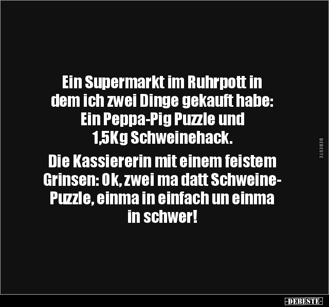 Ein Supermarkt im Ruhrpott in dem ich zwei Dinge gekauft habe: Ein Peppa-Pig Puzzle und 1,5Kg Schweinehack. Die Kassiererin mit einem feistem Grinsen: Ok, zwei ma datt Schweine- Puzzle, einma in einfach un einma in schwer!