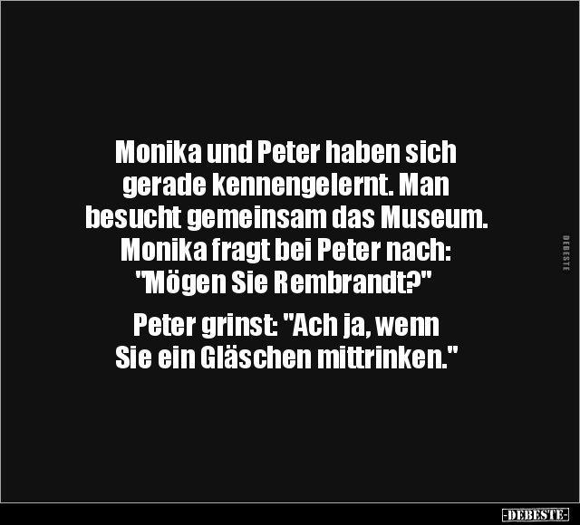 Monika und Peter haben sich gerade kennengelernt. Man besucht gemeinsam das Museum. Monika fragt bei Peter nach: "Mögen Sie Rembrandt?" Peter grinst: "Ach ja, wenn Sie ein Gläschen mittrinken."