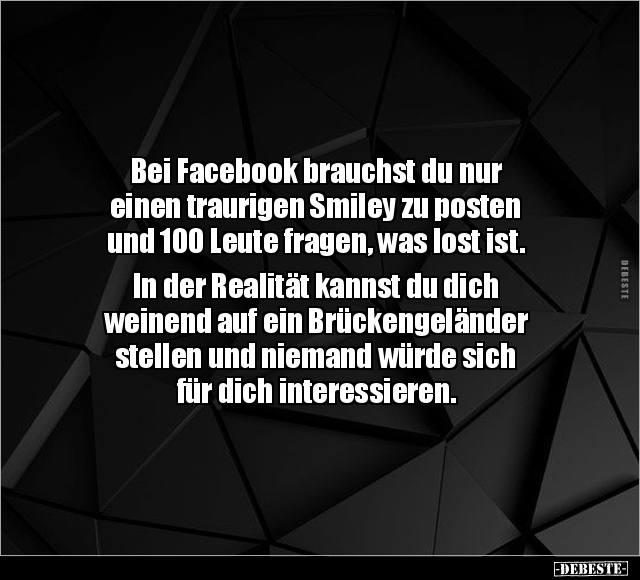 Bei Facebook brauchst du nur einen traurigen Smiley zu posten und 100 Leute fragen, was lost ist. In der Realität kannst du dich weinend auf ein Brückengeländer stellen und niemand würde sich für dich interessieren.